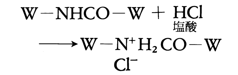 Wはタンパク質の直鎖状高分子部分を表す。また,羊毛は5%の苛性ソーダ水溶液に溶解するが,酸には溶解しない。また,希硫酸や希塩酸中では酸を吸収して塩を形成する。このとき羊毛の強度の低下が起こる。