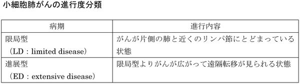 小細胞肺がんについては、TNM分類のほか、予後と治療方針を反映する分類として限局型(LD)と進展型(ED)の2期に分類する。LDは、病巣が同側胸郭(きょうかく)内に加え、対側縦隔、対側鎖骨上窩(じょうか)リンパ節までに限定され、かつ悪性胸水や心嚢水(しんのうすい)(心臓を包む膜内に体液が貯留した状態)を有さないもので、この範囲を超えて進行したものがEDとなる。