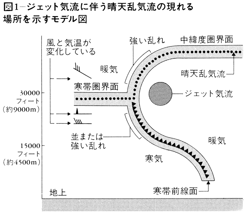 (3)巡航 ジェット機は高空を飛ぶため、悪天の影響は少なくなったが、晴天乱気流(CAT(キャット))、高高度の山岳波は依然としてやっかいである。理由は、これらは発現する範囲が狭く、寿命も短いので、直接予報できないし探知する機器がないからである。また、低高度を飛ぶ航空機は種々の悪天に遭遇するが、雷雲によるものは機上レーダーで回避できる。