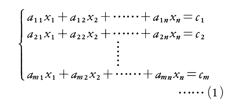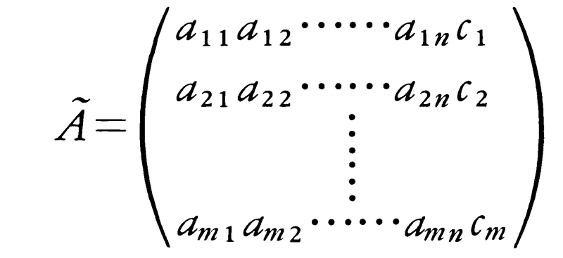 を(1)の拡大係数行列という。(1)のc1,……,cmが0である連立一次方程式,