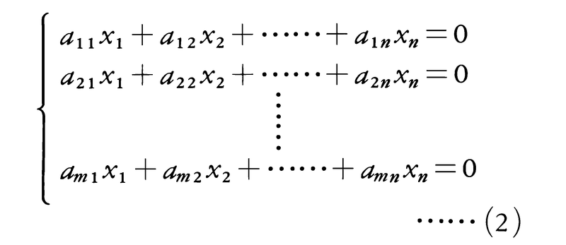 を斉次連立一次方程式という。(b1,……,bn),(b1′,……,bn′)が(2)の解ならば,任意のα,α′について,(αb1+α′b1′,……,αbn+α′bn′)も(2)の解になる。すなわち,斉次連立一次方程式の解全体は行ベクトルが作る線形空間の線形部分空間になる。係数行列Aの階数をrとすると,この部分空間の次元はn-rになる。(1)の解(d1,……,dn),(d1′,……,dn′)を取ると,(d1-d1′,……,dn-dn′)は(2)の解である。逆に,(d1,……,dn)が(1)の解ならば,(2)のかってな解(b1,……,bn)について,(d1+b1,……,dn+bn)は(1)の解である。したがって,(1)の解(d1,……,dn)を一つ取ってくれば,{(d1+b1,……,dn+bn)|(b1,……,bn)は(2)の解}が(1)の解全体である。ところで,
