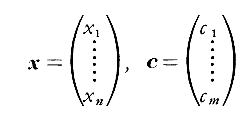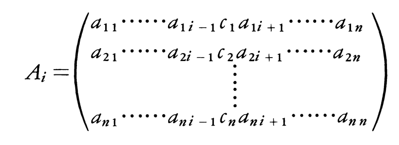 を取れば,(1)はAx=cと書ける。今m=nで,Aの行列式|A|が0でないとすると,Aは逆行列A⁻1をもつ。上記の行列の式の両辺に左からA⁻1をかけることにより,x=A⁻1cを得る。すなわち,連立一次方程式(1)はただ一つの解をもち,その解は上の式で書ける。この解を具体的に書くと,Xi=|Ai|/|A|となる。ここで,AiはAのi列をcで置きかえた行列,