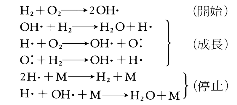 塩素-水素の場合と異なり,連鎖の成長のときに相次いで活性な中間体がつくられ,それらの濃度が急速に増大していく。これが激しい爆発を起こす理由である。連鎖反応が盛んに起こっているとき,温度も高くなり,ほとんどの分子が活性化されているので,連鎖を停止させるためには,活性中間体の再結合により放出されるエネルギーを効果的に除くための第三物体(冷却した器壁など)の存在が必要である。