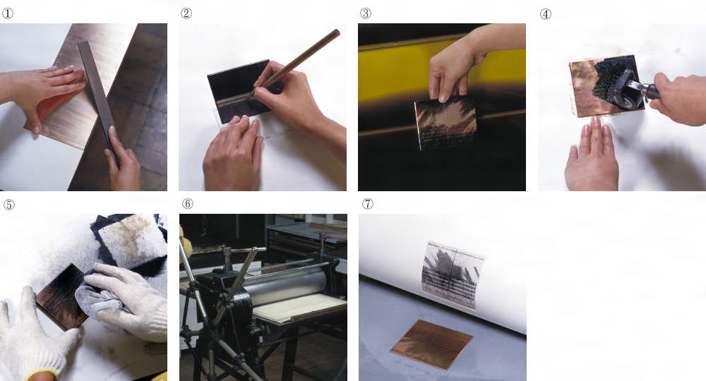 銅板を版材とする版画の総称。一般的には、鉄板・亜鉛板を同様の方法で用いたものも含む。銅版画の印刷は凹版法によるが、製版の方法は直接法(乾式)と間接法(湿式=腐蝕(ふしょく)法)に大別でき、いずれも種々の手法があり、また、しばしば混用される。銅版画は木版画に次いで古い版画の方法であり、14世紀から15世紀の変わり目ごろ、北ヨーロッパとイタリアで相次いでおこった。木版画が大工の技術のなかから発達し、表現も技巧も民衆芸術的な趣(おもむき)をもつのに対し、銅版画は金工師の技術に由来し、最初から工芸的な質の高さがあって、貴族などに好まれた(銅版画の歴史については、「版画」の項を参照されたい)。