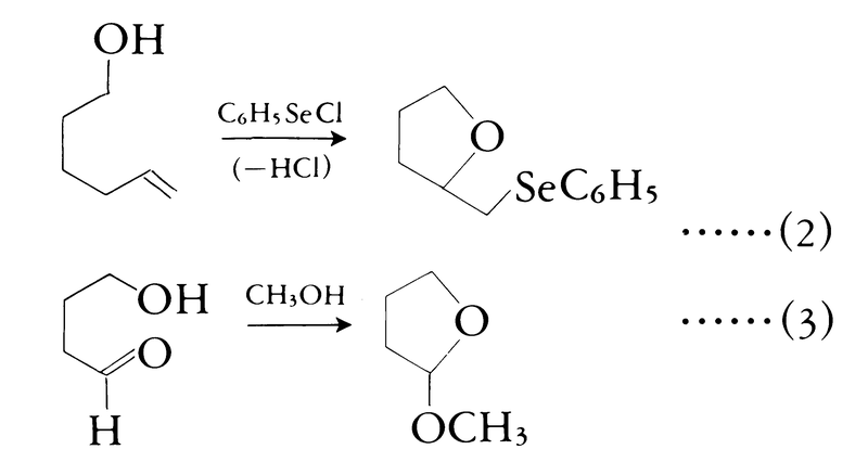 (2)分子内付加による閉環 これはC=C結合などの不飽和結合に分子内の官能基が付加して閉環する場合で,式(2)のように,分子内オキシセレン化反応でテトラヒドロフラン環を生成する例や式(3)のように,分子内アセタールを形成する例があげられる(付加)。