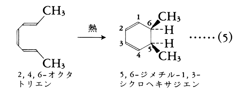 (4)共役π電子系が熱または光によって閉環する場合 共役π電子系はπ電子数によって,熱または光で閉環する。式(5)に示すように,2,4,6-オクタトリエンは6π電子系なので熱で閉環し,立体選択的に5,6-ジメチル-1,3-シクロヘキサジエンを生成する。この閉環反応において,メチル基の立体化学は互いにシスの関係にあるものだけが生成して他方の異性体が生成しないことは,ウッドワード=ホフマン則で説明された。