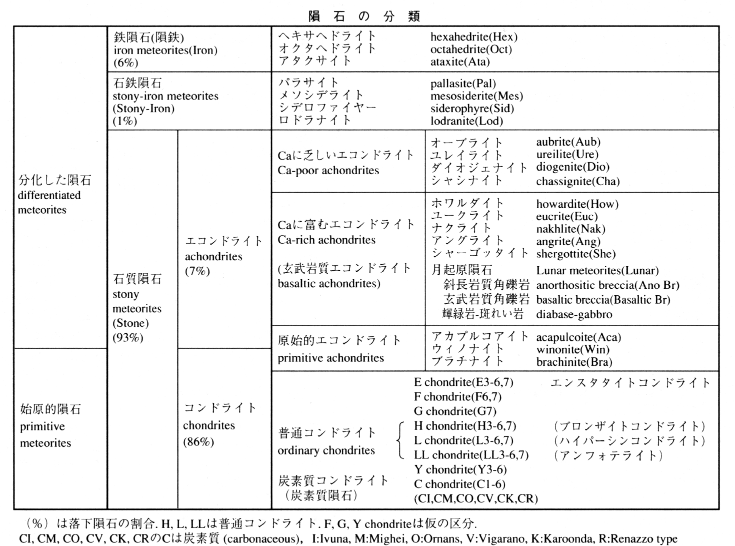 ニッケルNi,鉄Feがいくら含まれていたかにより鉄隕石(隕鉄),石質隕石および石鉄隕石に大別される。石質隕石はさらに化学組成と組織により細分され,コンドルールとよばれる球状物質を含むか含まないかでコンドライトとエコンドライトに分類される。化学組成が原始太陽系の始原的物質に近いものは始原的隕石,溶融,固化などにより物理的・化学的に分離したものは分化した隕石といわれることがある。鉄隕石,石鉄隕石,エコンドライトは後者に属する。コンドライトは,含まれる金属鉄,全鉄量によりエンスタタイト(E)コンドライト,オーディナリー(O)コンドライト(H,L,LLの3種よりなる)および炭素質(C)コンドライトに分類される。Oコンドライトは形成後の熱変成の度合の低い方から高い方へ1より6の番号を付け,これをH,L,LLの後につけてH6というふうに分類される。エコンドライトは,ほとんどエンスタタイト(MgSiO3)のみよりなるオーブライト,玄武岩質の岩石に似ているユークライト,ホワルダイトおよびダイオジェナイト,ユレイライトなどに細分される。メソシデライトとパラサイトは石鉄隕石のおもなものである。鉄隕石にはそのニッケル量と組織の異なるヘキサヘドライト,オクタヘドライトおよびアタクサイトの3種がある。