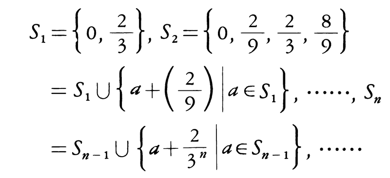 カントルの三進集合とも呼ばれ,次のように定義される。一般に,a,bが実数でa<bのとき,[a,b]および(a,b)はそれぞれ{x|a≦x≦b},{x|a<x<b}を表すものとし,