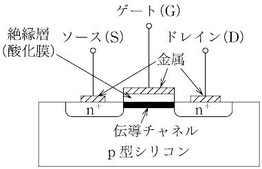 抵抗率の高いp型シリコンの表面を高温で酸化すると,表面にSiO2の絶縁層ができると同時に,その直下に O2 が拡散してn型層が形成される.SiO2の表面に真空蒸着法などで金属をつけてゲート電極とする.電流を流し込むソース電極と,取り出すドレイン電極になる部分にリンなどを拡散して n+ 領域を形成してその上に金属電極をつける.ゲートに正電圧を印加すると,ゲート電極直下のn領域の伝導チャンネル部分に電子が引張り込まれて,チャンネル部分の抵抗が減少し,ソース-ドレイン間の電流は増加する(enchancement mode).逆にゲート電圧を負にすると,チャンネル部分の電子が押し下げられて電子が減少して,ソース-ドレイン間の電流は減少する(depletion mode).また,チャンネル部分はp型でもよく,この場合には,enchancement modeのみになる.ゲート部の構造からMOSトランジスターとよばれている.しかし,絶縁層は必ずしもoxideではなく窒化シリコンなども用いられるので,この場合oxideのかわりにinsulator(絶縁体)のIをとってMISトランジスターというほうが一般的である.MOSトランジスターは,接合型トランジスターと比べて入力インピーダンスが高くて使いやすいので,現在,集積回路に多く使われている.